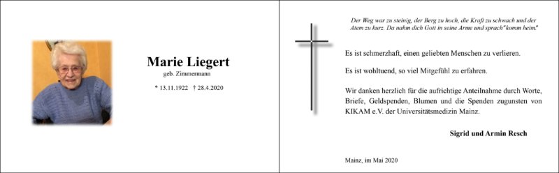 Die Beerdigung findet am Donnerstag, den 07. Mai 2020, um 14.00 Uhr in einem ganz kleinen Kreis auf dem Friedhof in Mainz-Gonsenheim statt.